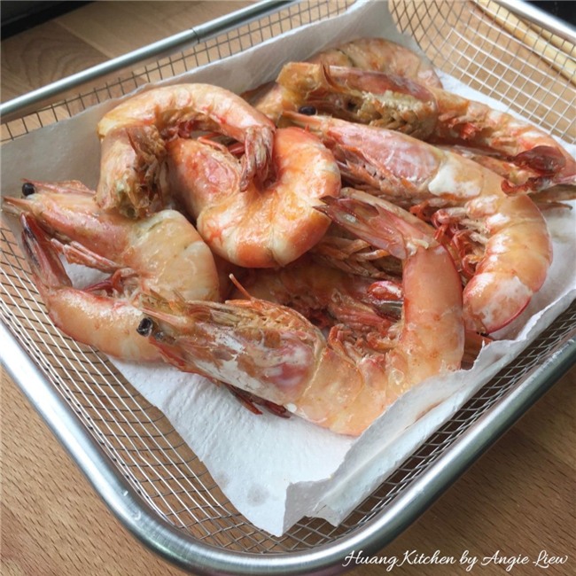 Khi tôm đã chín gắp ra rổ đã lót sẵn giấy thấm dầu.