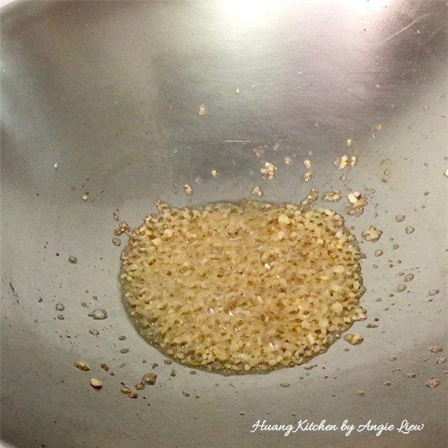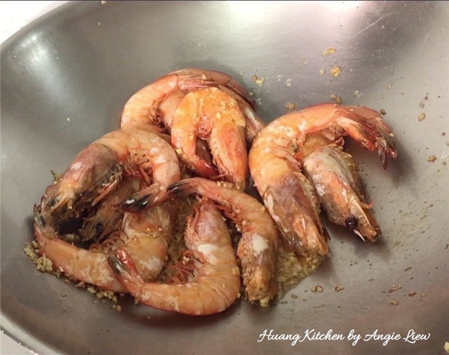 Cũng trong chảo vừa chiên tôm nếu thừa nhiều dầu quá thì đổ bớt đi sau đó cho tỏi và gừng vào chiên vàng.