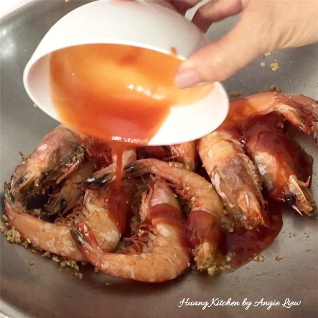 Trút phần hỗn hợp sốt vào, đảo đều sao cho phần sốt quyện đều vào từng con tôm. Đun sôi trở lại thì tắt bếp.