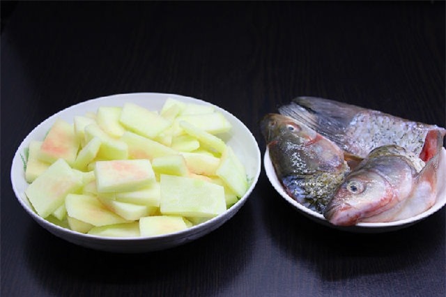 Vỏ dưa hấu gọt bỏ phần vỏ xanh chỉ lấy phần cùi trắng, thái vỏ dưa hấu thành miếng vừa ăn. Đầu và đuôi cá rửa sạch.