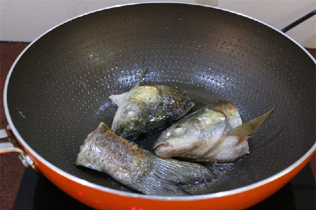 Ướp đầu và đuôi cá với một ít muối, nước tương sau đó đun nóng dầu ăn trong chảo, cho đầu và đuôi cà vào chiên vàng đều hai mặt.