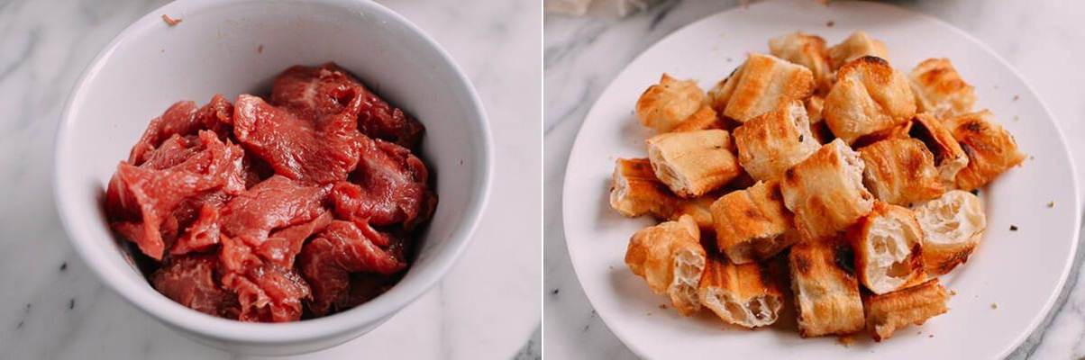 Thịt bò rửa sạch thái lát cho vào bát. Ướp thịt bò 10 phút với 1 thìa canh tinh bột ngô, 1 thìa cà phê baking soda và 30ml dầu ăn trộn đều. Quẩy cho vào lò nướng nướng cho giòn hoặc cho vào chảo chống dính để nướng lại cho giòn. Cắt quẩy thành miếng vừa ăn.