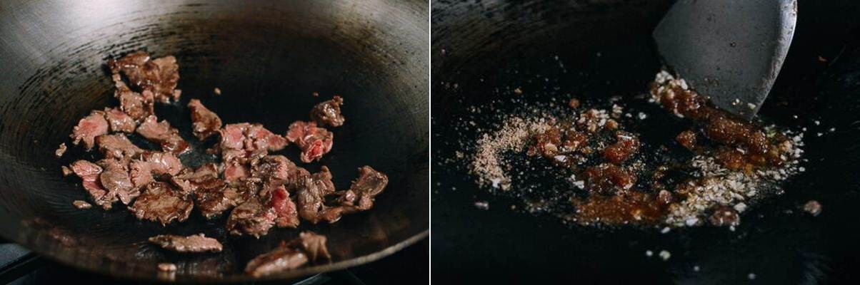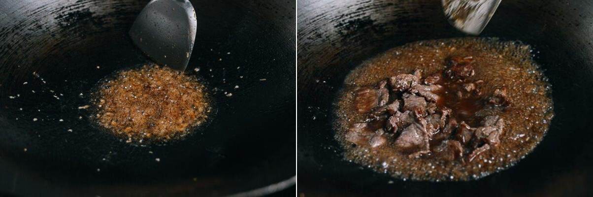Thêm một chút nước, nước tương, giấm gạo vào đảo đều rồi đun sôi. Tiếp theo đổ thịt bò vào.