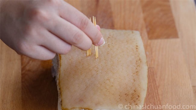 Sau đó, vớt thịt ra để ráo, dùng tăm nhọn xiên đều khắp mặt da của miếng thịt.