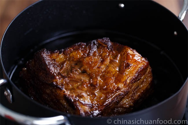 Sau đó, xát nước tương đậm đặc lên khắp đều khối thịt rồi để cho thịt ngấm khoảng 15 phút. Cho dầu ăn vào chảo khoảng 2cm, đun nóng dầu rồi cho khối thịt vào chiên vàng đều 2 mặt (khoảng 6-8 phút mỗi bên là được).