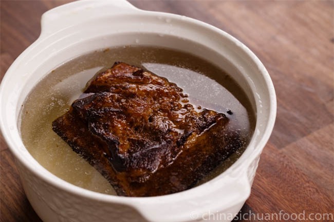Sau đó, gắp khối thịt ra và ngâm trong nước ấm ít nhất 30 phút cho đến khi phần da heo mềm.