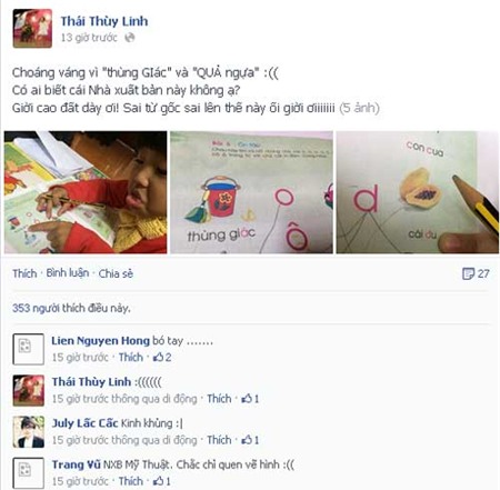 Quá thảng thốt vì đã lựa chọn sách cho con từ một nhà xuất bản uy tín nhưng vẫn “dính” phải các lỗi trầm trọng, ca sĩ Thái Thùy Linh bức xúc: “Choáng váng vì ‘thùng giác’ và ‘quả ngựa’. Giời cao đất dày ơi. Sai từ gốc sai lên thế này ối giời ơi…”