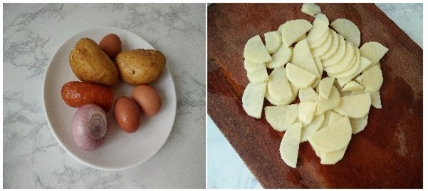 Khoai tây gọt vỏ sau đó cắt đôi rồi cắt thành từng miếng mỏng như hình. Sau đó, bạn bắc nồi lên bếp cùng chút nước để luộc sơ qua.