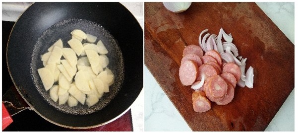 Trong lúc đó, chuẩn bị hành tây và xúc xích thái mỏng.