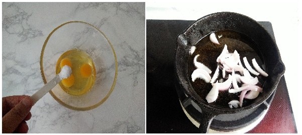 Đập trứng ra tô rồi đánh tan cùng một chút muối. Tiếp đến bạn bắc chảo lên bếp cùng 2-3 muỗng canh dầu olive. Khi dầu nóng đều thì cho hành tây vào xào.