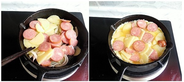 Tiếp đến cho khoai tây và xúc xích vào và rắc lên chút muối và tiêu xay. Sau đó bạn cho trứng vào, để yên trong vòng 2-3 phút.