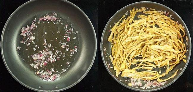 Bạn cho vào chảo 1-2 thìa cà phê dầu ăn và phi thơm phần hành tím đã băm nhỏ. Khi hành dậy mùi thơm, bạn đổ phần măng đã sơ chế vào chảo. Thêm 1-2 thìa cà phê hạt nêm và xào măng khoảng 3 phút trên lửa vừa.