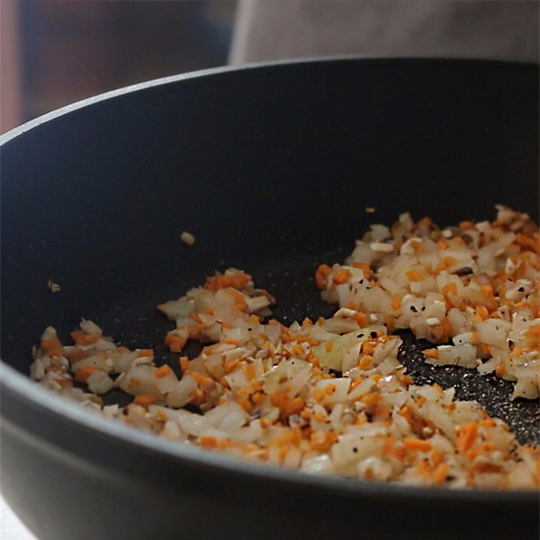 Làm nóng chảo với chút dầu láng mặt, cho hành tây xắt hạt lựu, nấm và cà rốt vào đảo thơm. Kế đó rắc thêm chút tiêu và muối, đảo đều rồi tắt bếp.