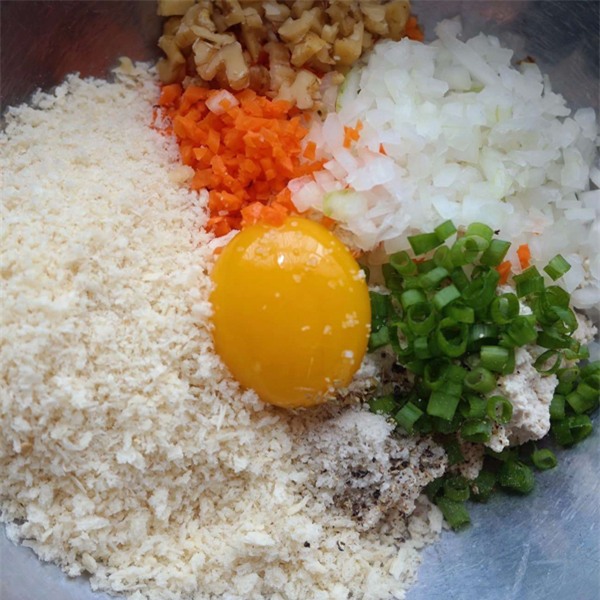 Chuẩn bị một tô trộn, cho đậu phụ vào cùng hành lá, trứng, bột chiên xù, tiêu, muối, rau mùi thái nhỏ và phần hàng - nấm – cà rốt vừa xào chín. Đeo bao tay thực phẩm vào rồi dùng tay bóp trộn cho các nguyên liệu quyện đều.