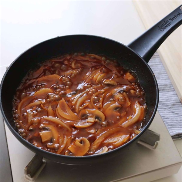 Làm nóng chảo trở lại với bơ. Chờ bơ tan chảy thì cho tỏi, hành tây và nấm thái mỏng vào đảo thơm. Kế đó cho tương cà chua, dầu hào, sốt ướp thịt bò và nước vào đun sôi thì hạ lửa. Tiếp tục đun thêm 3 phút cho sốt thấm và sánh mượt thì tắt lửa. Rưới sốt lên đĩa đã sắp sẵn bít tết đậu phụ và dùng nóng.