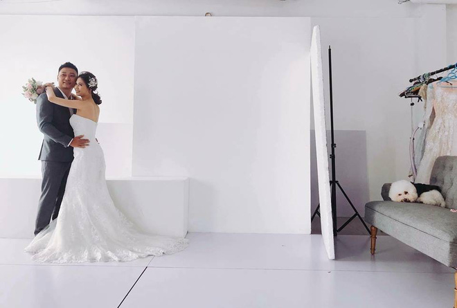 Vợ chồng em tranh thủ ôm hôn, tạo dáng vài chục kiểu trước khiến nó chờ hơi lâu một chút. Đến lúc gọi vào là mặt nó sưng lên, hằm hằm như thịt bằm nấu đông thế này đây, còn gì là bộ ảnh!" - Facebook Huyền Trân chia sẻ.