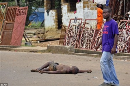 Hình ảnh chân thực được phóng viên hãng AP ghi nhận tại Liberia khiến người dân trên toàn thế giới sợ hãi, bàng hoàng trước sự càn quét khủng khiếp của đại dịch Ebola. Tuy nhiên, người đàn ông này chỉ là 1 trong số rất nhiều nạn nhân thiệt mạng do nhiễm virus Ebola và bị chính người thân ném ra khỏi nhà, nằm chỏng chơ, bơ vơ giữa đường phố. Do quá sợ hãi và lo lắng bệnh dịch lây lan mà chính những người ruột thịt nhất của các nạn nhân cũng không dám tiếp xúc hay đưa người quá cố đi chôn cất.