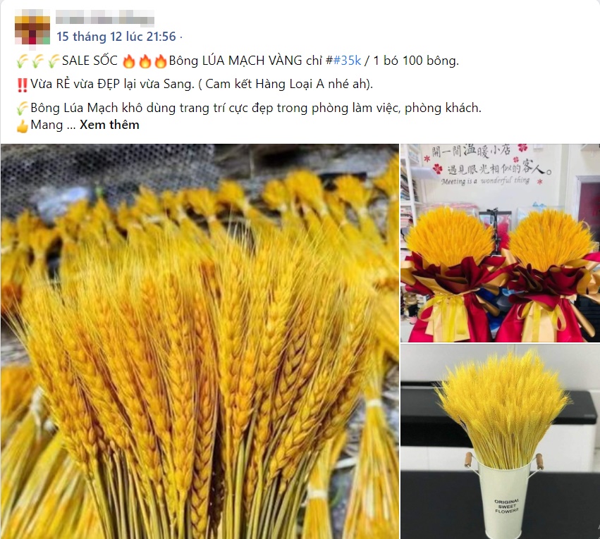 Bông lúa mạch vàng được bán với giá 35k/bó/100 bông được rất nhiều người yêu thích. Ảnh chụp màn hình.