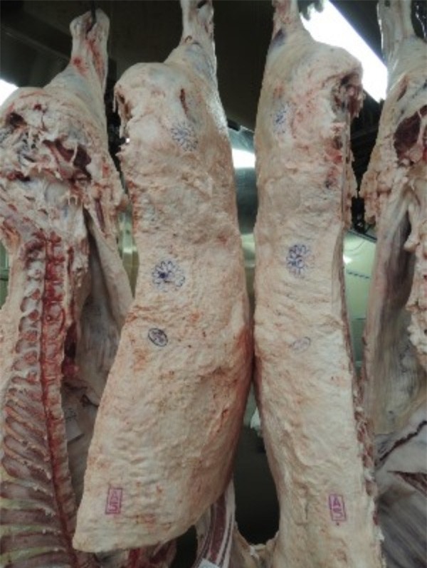 Thịt bò tại xưởng giết mổ. Dấu A5 cho thấy chất lượng của thịt bò. Dấu sao màu xanh da trời xác nhận đây là bò Kobe.
