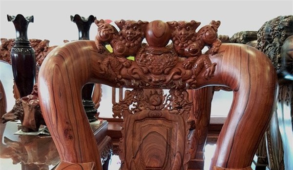 Ông Ngọc Châu, chủ doanh nghiệp chế biến gỗ cho hay, bộ salon trắc tay 20 gồm 10 món đều là gỗ trắc 100%, hoàn thành với 7 khối gỗ. Đây là loại gỗ quý trong tự nhiên, thân gỗ khi xẻ ra chế tác có màu đỏ.Bốn ghế dài ngồi cao 160m ngang, mặt ghế dầy 5cm, rộng 80 cm và dài 110cm. Hoa văn trên ghế được chạm khắc tinh xảo với hình rồng uốn lượn và các điểm nhấn như tay đầu rồng. Vân gỗ nổi lên tạo ấn tượng cho bộ ghế.