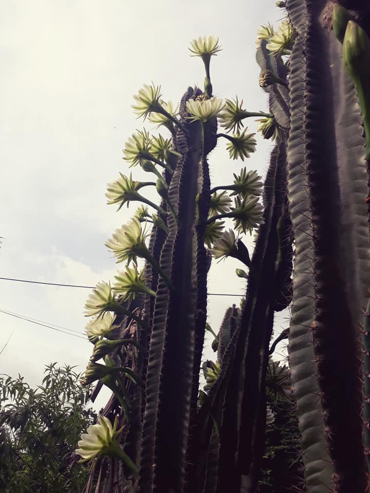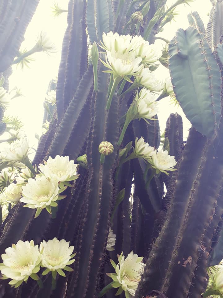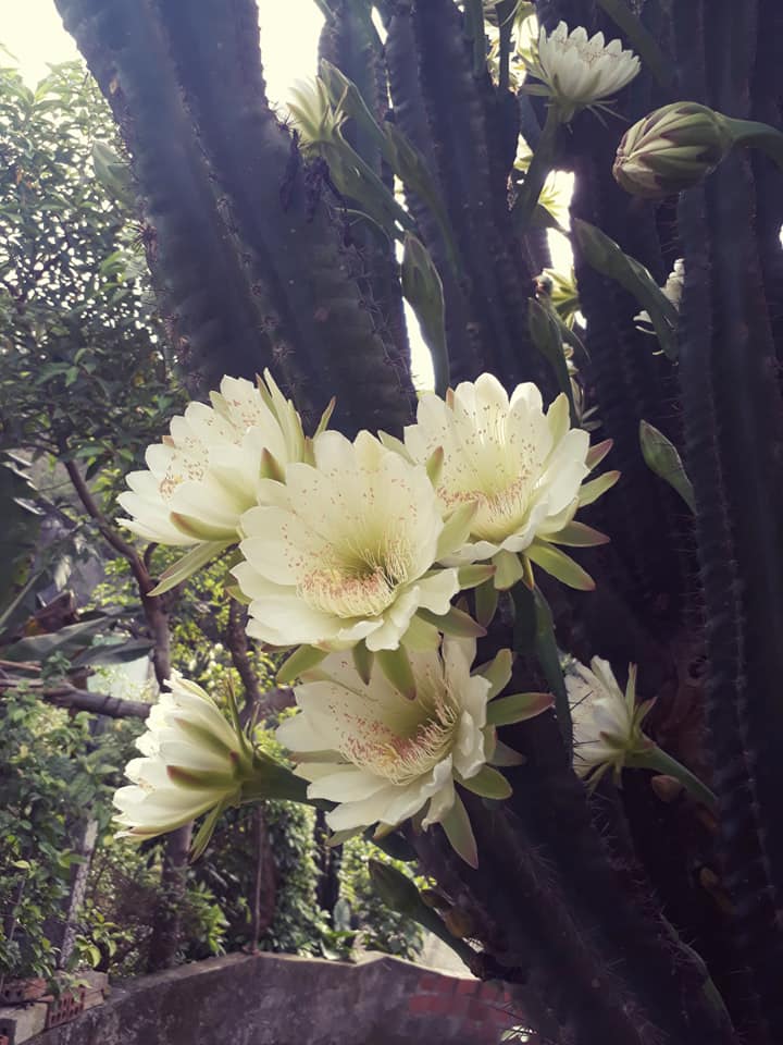 "Cây xương rồng nhà tớ trồng gần 30 năm nay rồi. Mỗi mùa ra hoa là ong bay đến bâu quanh luôn. Hoa của nó chỉ ra vào sáng sớm tới 9h sáng là tàn rồi. Hôm nay là 1 đợt hoa đấy. Nghe tin cây ra hoa ớ phải phi vội về nhà để chụp lại. Hoa không có mùi thơm nhưng nhìn hoa mà lòng ngất ngây" - Hằng chia sẻ.