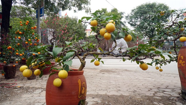 Những chậu chanh nhỏ hơn được trồng trong bình gốm. Ngoài điểm bán tại Lạc Long Quân, nhà vườn tăng cường thêm điểm bán ở Long Biên để phục vụ đủ cho nhu cầu của khách hàng.