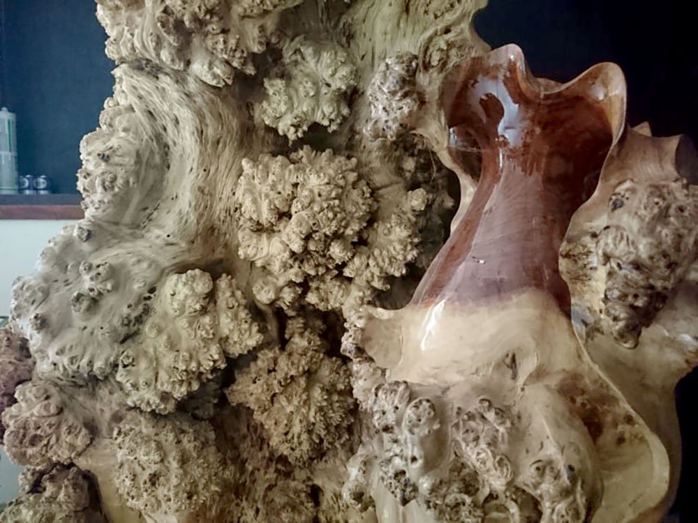 Nhìn tổng thể, chiếc đồng hồ mang vẻ đẹp hoang sơ của núi rừng, thân đồng hồ uốn lượn mềm mại. Những đoạn mắt cây được chế tác thành những khóm lá ôm lấy thân. Ông chủ của nó đã phun thêm lớp sơn, làm cho chiếc đồng hồ thêm bóng bẩy, lộng lẫy giữa phòng trà sang trọng.