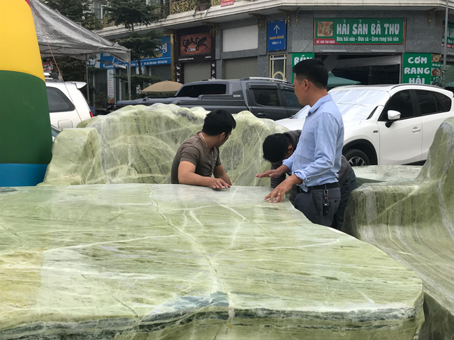 Bộ bàn ghế được làm từ ngọc Serpentine. Loại ngọc này lấy từ một núi ở Yên Bái.