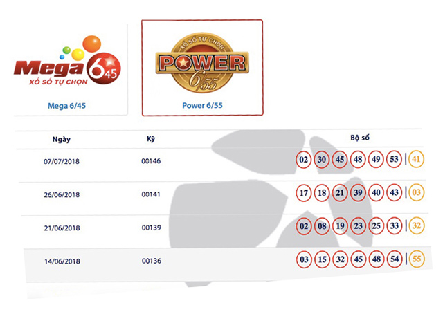 Trong đó, với chương trình Mega 6/45 là 2 giải jackpot tương ứng 2 vé trúng, còn với chương trình Power 6/55 là 4 giải jackpot tương ứng 5 vé trúng. Tổng giá trị các jackpot nói trên là hơn 121 tỉ đồng, trong đó vé trúng jackpot nhỏ nhất là gần 2 tỉ đồng và cao nhất lên tới hơn 45 tỉ đồng.