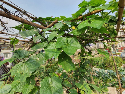 Diện tích sân thượng khoảng 40 m2, được chị Thanh khéo léo bố trí trồng được 60 gốc dưa, gồm các giống nước ngoài thuộc Nhật Bản, Hàn Quốc.