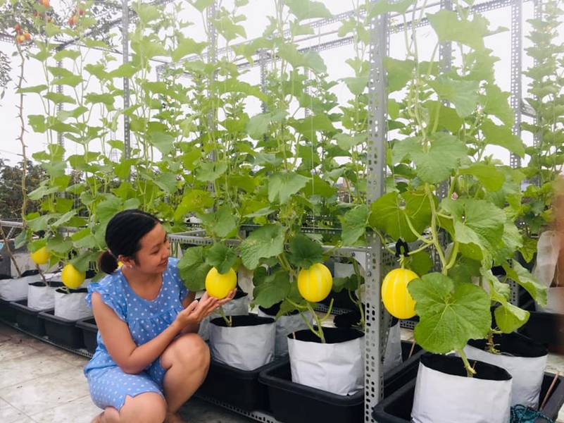 Chị Phương Thanh, là một nhân viên văn phòng ở Nhơn Đức, Nhà Bè (TP HCM). Tuy công việc bận rộn nhưng chị còn có thêm niềm đam mê, đó là trồng rau quả sạch trên sân thượng của gia đình. Chị Thanh bắt tay vào trồng cây, tạo nguồn thực phẩm sạch cho gia đình gần một năm nay. Khu vườn trên mây ấy ngoài rau sạch ăn hàng ngày,cô vợ đảm đang này còn thử sức với dưa lưới hữu cơ.