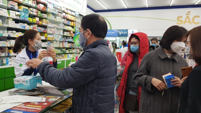 Trong quầy thuốc vô cùng nóng nực và khó thở vì có tới hàng chục người đứng trong xếp hàng chờ mua khẩu trang.