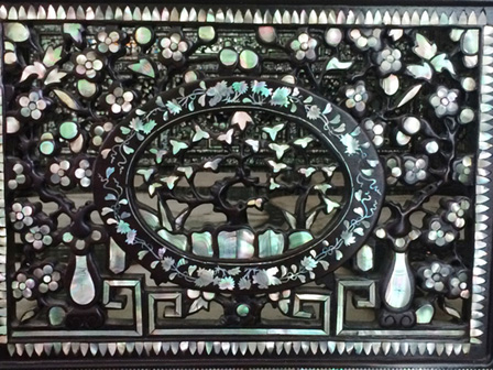 Toàn bộ chiếc giường được cẩn xà cừ với nhiều hoa văn tinh xảo.