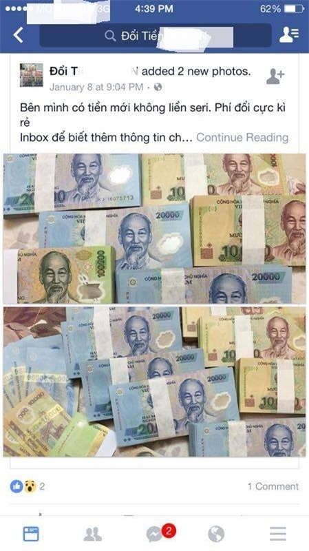 Trao đổi với một điểm đổi tiền trên facebook, vị này cho biết, các loại tiền mới mệnh giá nhỏ từ 50.000 đồng trở xuống đều có nhưng "càng nhỏ phí đổi càng đắt". Ví dụ, 1 thếp tiền 10.000 đồng, người cần đổi tiền mất thêm 220.000 đồng; 1 thế tiền 20.000 đồng mất phí đổi 300.000 đồng và thếp tiền 50.000 đồng mất phí đổi 300.000 đồng...
