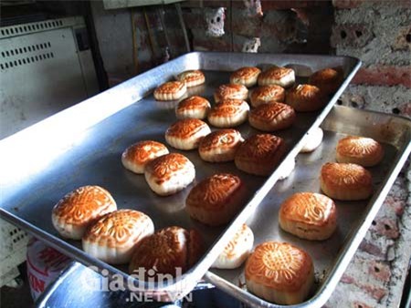 Tại đây, nhân bánh (gồm bột nếp kèm nhân đỗ xanh hoặc thập cẩm) được nặn vào trong lớp bột mì rồi ép khuôn, quét qua một lớp trứng rồi nướng trong lò (15 phút).