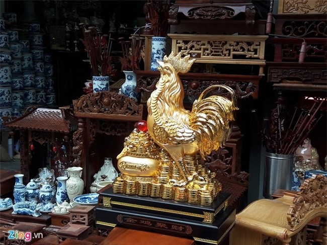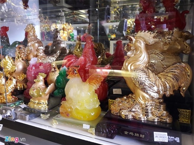 Tại các cửa hàng này, gà linh vật có nhiều loại đa dạng hơn. Có loại làm bằng gốm sứ mạ kim loại màu vàng, có loại làm bằng đồng, có loại làm giả đồng… Điểm chung của các loại gà linh vật này là rất đa dạng mẫu mã và giá cả phải chăng.