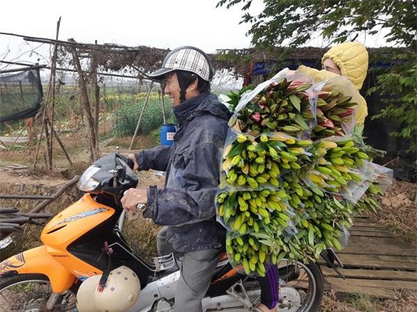 Chia tay chị Vinh, chúng tôi đi dọc theo con đường đồng, hai bên thơm ngát mùi hương hoa ly, cứ vài trăm mét lại bắt gặp những người nông dân chở vài bó ly trên xe máy để đem ra chợ bán mong gỡ được chút vốn.
