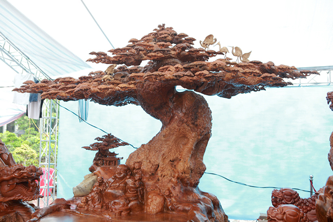 Nguyễn Ngọc Minh, chủ nhân của tác phẩm cho biết, bộ bàn ghế này làm hoàn toàn bằng gỗ nu đinh hương nghìn năm tuổi, rất quý hiếm, có giá 5 tỷ đồng.