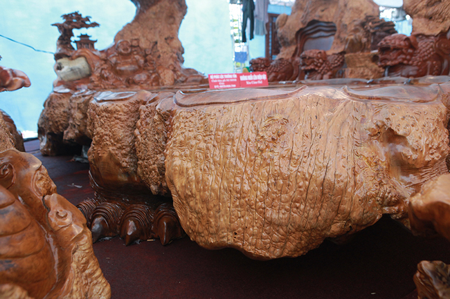 Theo anh Minh, để có một bộ bàn ghế bằng gỗ nu đinh hương này rất khó khăn, nhiều năm mới gom được số gỗ lớn như vậy. Trong quá trình làm đã hỏng vài bộ, cuối cùng mới có được một bộ hoàn chỉnh như vậy.