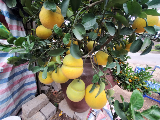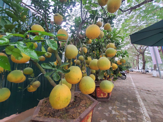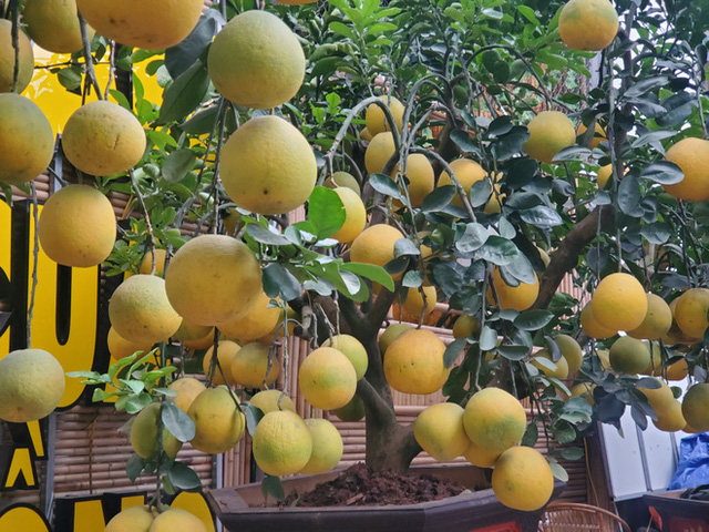 Những gốc bưởi có tuổi đời từ 7 - 20 năm được ghép hàng trăm quả bưởi Diễn vàng óng có giá từ 25-40 triệu đồng đã được nhà vườn đưa xuống phố, phục vụ nhu cầu mua cây cảnh Tết.