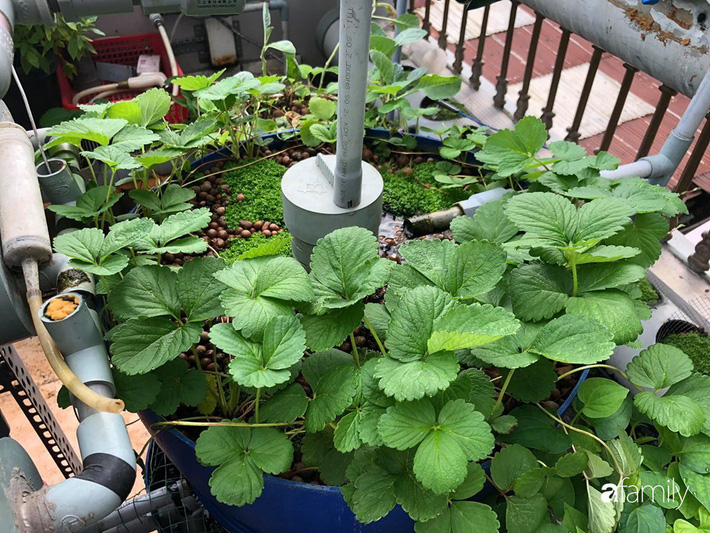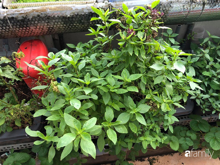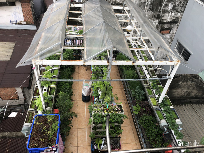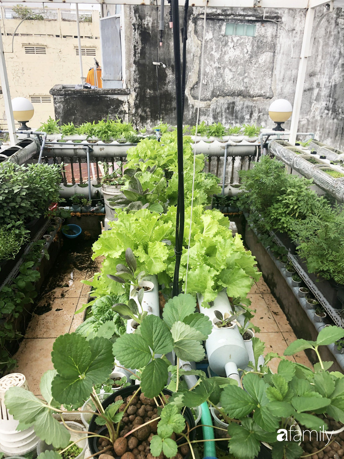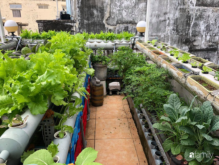 Khu vườn sân thượng của gia đình anh khá thoáng đãng, được anh thiết kế kiên cố với mô hình Aquaponics, trồng rau nuôi cá. Ông bố trẻ thử nghiệm trồng rất nhiều các loại rau quả sạch, từ rau gia vị, rau ăn lá đến các loại quả... Khoảng vườn luôn xanh mát, tươi tốt một màu khiến ai ngắm nhìn cũng khâm phục ngưỡng mộ.