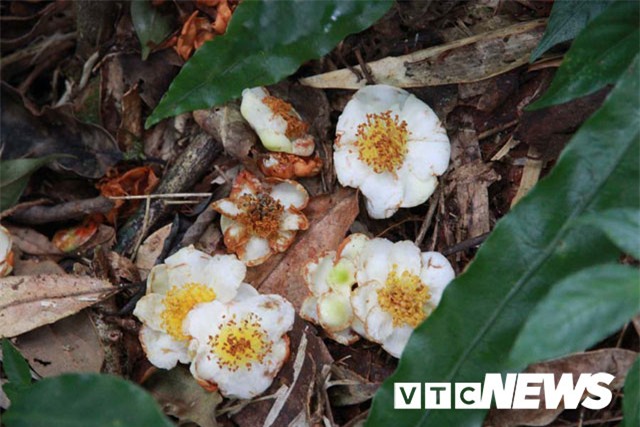 | Khi hoa chè rụng xuống đất mới phát hiện có chè, vì phần lớn chè cổ thụ mọc cao, khó quan sát lá. |