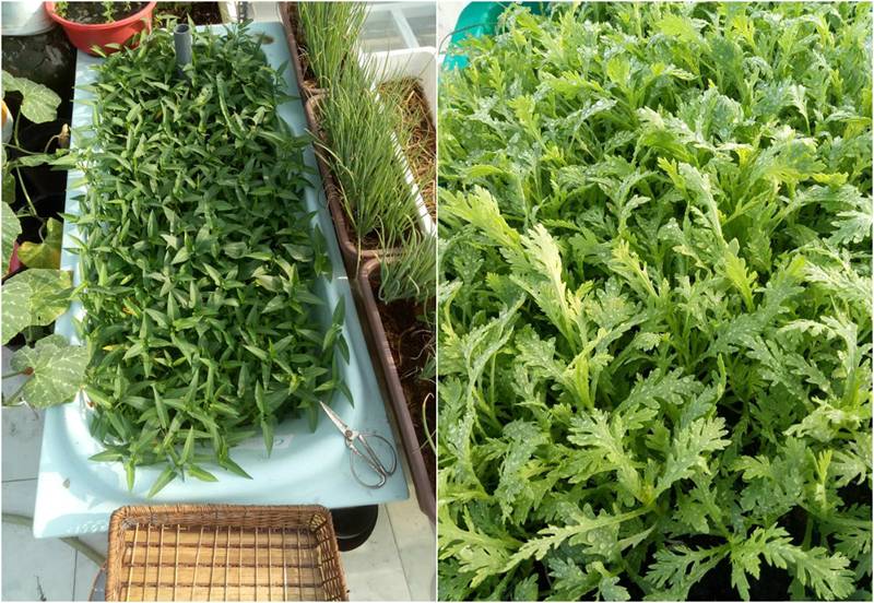 Vì diện tích sân thượng hạn chế, để có đủ rau ăn hàng ngày cho gia đình nên chị chủ yếu trồng rau theo mùa. Mùa đông chị trồng các loại rau cải, cà chua, ớt. Mùa hè thường trồng mùng tơi, dền, muống, bầu, bí… Ngoài ra, chị tận dụng khoảng ít nắng để trồng cây gia vị, tận dụng khoảng trên cao để trồng cây leo giàn tăng thêm thực phẩm sạch cho gia đình.
