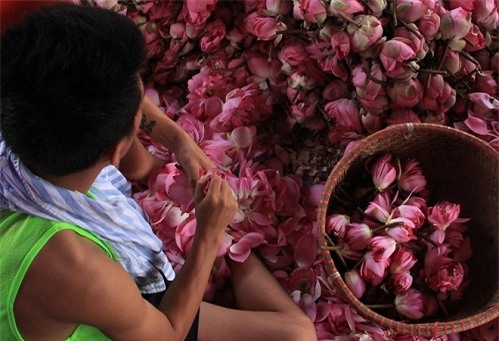 Dưới bàn tay khéo léo và chuyên nghiệp, các bộ phận của sen được tách riêng rẽ. Ông Xiêm và bà Hiền chia sẻ, việc làm sen rất khó, đòi hỏi tính tỉ mẩn và bền sức, không nóng vội. Hầu hết, người làm sen là các thành viên trong gia đình và người quen, có người đã gắn bó với gia đình hơn 20 năm. Ông bà đã từng bỏ tiền ra thuê lao động bên ngoài với mức giá cao, nhưng sau đó họ đều nghỉ do công việc vất vả.