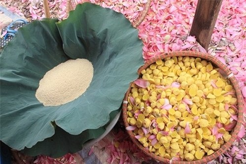 Trà mềm rồi thì cho 1 lớp trà rồi một lớp gạo, đợi ba ngày lại lấy ra đảo, lấy rổ sàng hết gạo sen cũ rồi lại thay gạo sen mới.
