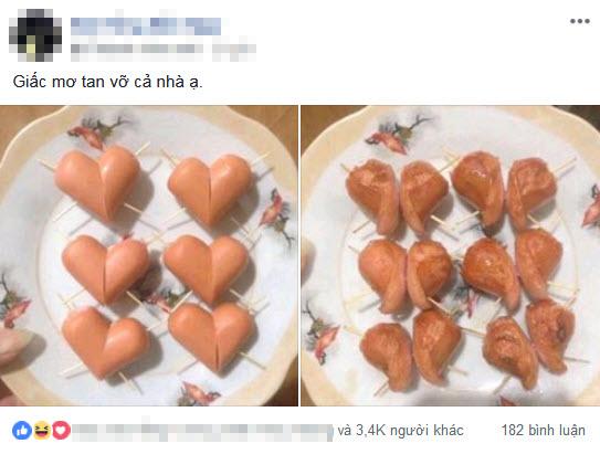 Tuy nhiên, "đời không như là mơ", không phải cứ bắt chước "nhà người ta" là có thể làm giống hệt. Thế mới có chuyện một cô nàng có tên facebook N.H.B.N hào hứng vào bếp với tinh thần quyết chiến làm món xúc xích trái tim, ai ngờ, tim đâu chẳng thấy, chỉ thấy "tan nát cõi lòng".