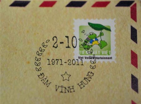 Thiệp sinh nhật lần thứ 40 của Đàm Vĩnh Hưng để tong một chiếc phong bì có dán tem và đóng dấu tên nam ca sĩ.