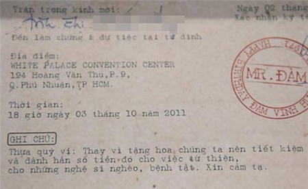 Có lẽ trong giới showbiz, Đàm Vĩnh Hưng là người đầu tiên có thiệp mời độc nhất từ trước đến nay. Còn nhớ năm 2011, trong lần sinh nhật thứ 40 của mình, anh cũng khiến nhiều người không thể nhịn được cười với tấm thiệp được giữ nguyên bản từ tờ giấy khai sinh để trong chiếc phong bì dán tem cẩn thận.