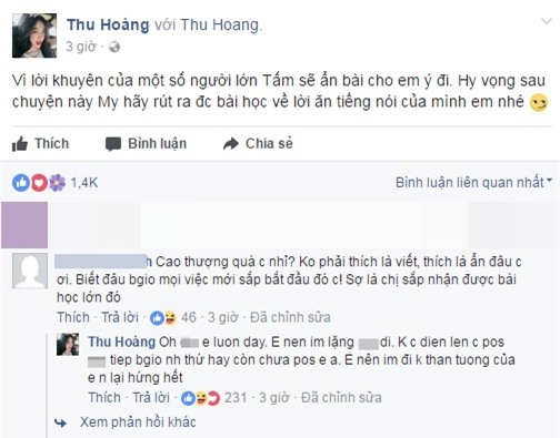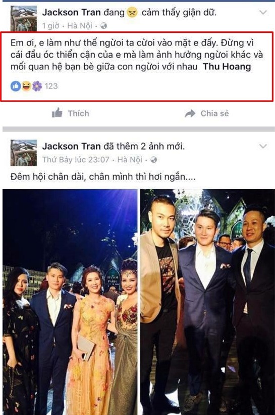 Jackson Tran viết: “Em ơi, em làm như thế người ta cười vào mặt em đấy, đừng vì đầu óc thiển cận của em mà làm ảnh hưởng đến người khác và mối quan hệ giữa bạn bè với nhau”. Status còn tag cả cô gái đã tố Huyền My.