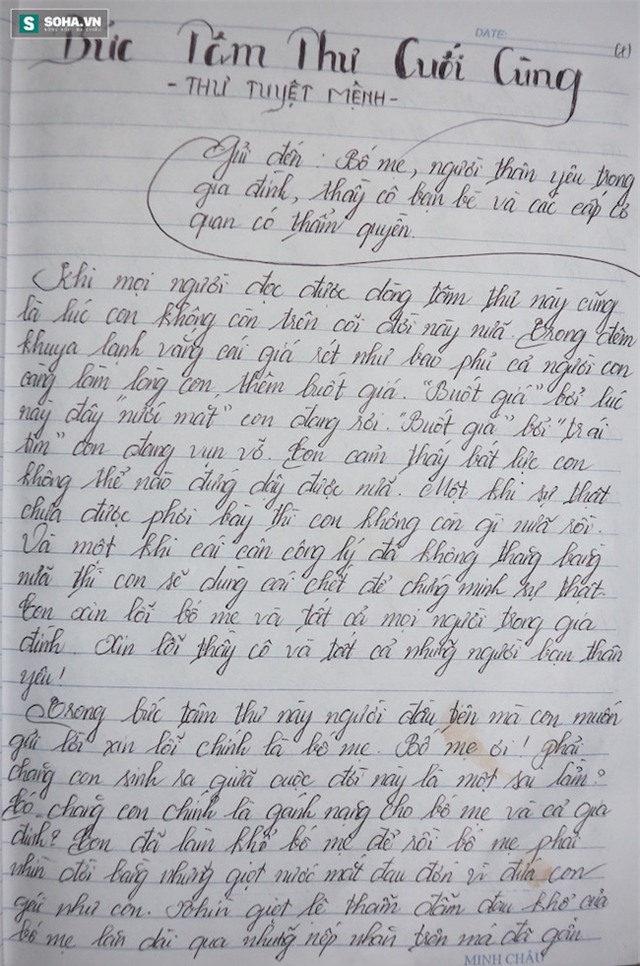 Trong bức thư tuyệt mệnh để lại, H. gửi lời cảm ơn đến gia đình, bạn bè thầy cô. Trong đó, thiếu nữ cũng nói lý do "vì cuộc đời không công bằng nên đã tìm đến cái chết để giải thoát và để chứng minh sự việc".